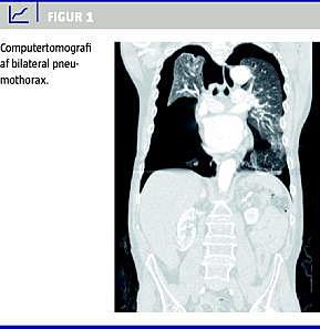 En 60-årig, slank mand med mental retardering, kronisk obstruktiv lungesygdom og dilateret kardiomyopati blev indlagt akut efter at have fået pludselig indsættende smerter i brystkassen. På skadestuen fandt man patienten svært respiratorisk dårlig med en påskyndet respirationsfrekvens på 40 pr. minut, blå marmorering over det meste af kroppen og halsvenestase. Han havde takykardi med en puls på 100, et blodtryk på 170/100 mmHg og en perifer iltsaturation på 88% med nasal ilt. Patienten blev umiddelbart behandlet med steroid givet intravenøst og terbutalininhalation uden at opnå bedring, og han var nu så påvirket, at han ikke kunne bidrage yderligere til anamnesen. Patienten svarede kun på tiltale med enstavelsesukvemsord, og det var derfor svært at vurdere smerteniveauet. Ved lungestetoskopi blev der fundet bilateralt luftskifte og ingen rhonchi. Et elektrokardiogram viste ikke tegn på akut myokardieinfarkt. En syre-base-status viste en pH-værdi på 7,1, et arterielt partialtryk for CO 2 på 10 kPa og et arterielt partialtryk for O 2 på 9,8 kPa. På mistanke om dissekerende aortaaneurisme foretog man en computertomografi af thorax og abdomen. Her kunne man konstatere svær bilateral pneumothorax (Figur 1 ), mest udtalt på højre side. Højre side blev aflastet akut med venflon, og patienten fik det klinisk en smule bedre. På intensivafdelingen blev der anlagt pleuradræn bilateralt, og han rettede sig efterfølgende nærmest momentant med normalisering af blodtryk, respirationsfrekvens og arterielle gastal.