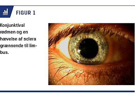 En 55-årig rask mand blev henvist til Øjenafdelingen Aalborg Universitetshospital på mistanke om persisterende episkleritis. Anamnestisk havde han haft hovedpine, stikkende øjensmerter ved øjendrejning og sløret syn gennem tre uger i det højre øje. Han havde ikke ingen gener fra øvrige organsystemer. Objektivt blev der fundet normalt syn (snellen 1,0) bilateralt og sektoral rødmen af conjunctiva på højre øje (Figur 1). På mistanke om persisterende højresidig episkleritis blev der givet tablet ibuprofen og dexamethasonøjendråber med god respons.