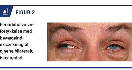 Efter 22 måneder blev han igen vurderet på Øjenafdelingen, da der var genopblussen af øjensymptomerne, men fortsat uden systemiske symptomer. Visus var 0,5 på højre og 1,0 på venstre øje. Objektivt var der bilateralt ingen introkulær reaktion, men der blev fundet øjenbevægelsesindskrænkning i alle retninger og glandelfortykkelse på halsen. En MR-skanning af orbita med og uden kontrast viste diffust patologisk signal anteriort i begge orbita og fortykkelse af samtlige ekstraokulære muskler (Figur 2). Efter uspecifikke resultater af en finnålsaspiration blev der udført glandeleksstirpation, konjunktivalbiopsi og PET-CT på mistanke om malign sygdom.