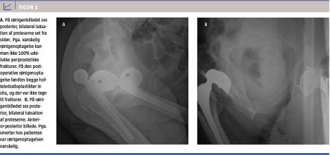 En 77-årig mand, som havde et alkoholoverforbrug, hjertesygdom og nedsat syn, blev indbragt som skadepatient med smerter i begge hofter efter at være faldet få trin på en trappe. Han havde i hhv. 1995 og 2007 fået bilateral THA. Angiveligt havde han ikke haft nogen tidligere luksationer. Ved den objektive undersøgelse fandtes højre underekstremitet at være indadroteret, og den venstre var flekteret. Trochanterpartiet var bagudtrukket på begge sider. Patienten var svært smerteforpint; smerterne stammede primært fra højre hofte. En røntgenoptagelse viste bilateral bagre dislokation uden tegn til frakturer (Figur 1). Røntgenoptagelsen var vanskeliggjort af svære smerter hos patienten. Fem timer efter ankomsten blev han anæsteseret, hvorefter proteserne kunne reponeres, begge ved vertikalt træk med patienten i rygleje. Proteserne blev testet og fundet stabile til 40 graders udadrotation på 90 graders fleksion og 0 graders adduktion. Repo-