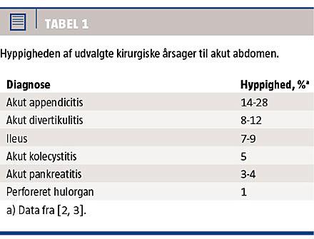 Akut opståede mavesmerter, såkaldt akut abdomen, er årsag til ca. 6,5% af alle henvendelser i akutmodtagelserne [1]. Årsagerne til akut abdomen er forskelligartede, og ikke alle tilfælde er behandlingskrævende.