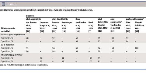 Billeddannende undersøgelser for akut appendicitis er UL-skanning, CT af abdomen med i.v. givet kontraststof og MR-skanning uden kontraststof (Tabel 2). Både UL-skanning og CT er sensitive og specifikke for diagnosen [10]. Sammenlignet direkte med UL-skanning har CT tendens til højere både sensitivitet og specificitet [10]. Derudover kan man både be- og afkræfte appendicitis med større sikkerhed med CT end med UL-skanning [10]. MR-skanning uden kontraststof som førstevalg har vist sig at være lige så sensitiv og specifik som en tilgang, hvor UL-skanning og efterfølgende CT blev brugt til diagnosticering af akut appendicitis [11].
