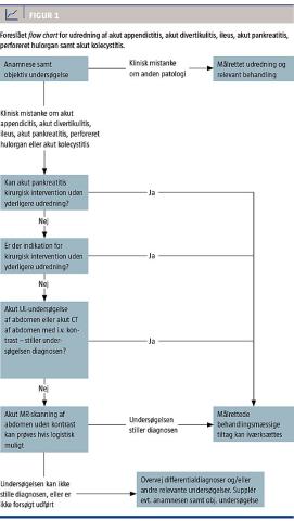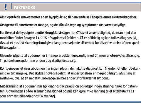 (Figur 1). MR-skanning har høj sensitivitet ved mange hyppige kirurgiske diagnoser og et stort fremtidigt potentiale i akut abdominaldiagnostik. På grund af strålingsfraværet må MR-skanning foretrækkes hos strålingsfølsomme patientgrupper.