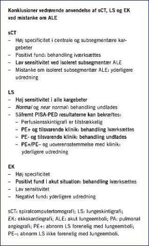 På baggrund af nærværende litteraturgennemgang konkluderer vi, at ingen undersøgelse er brugbar i alle situationer, hvor der er mistanke om ALE. sCT er velegnet til bekræftelse af ALE, men kan ikke bruges til afkræftelse af subsegmentær ALE, hvis forekomst og kliniske betydning dog er uafklaret. LS er anvendelig som be- og afkræftende undersøgelse, men tolket i henhold til PIOPED-kriterierne oftest inkonklusiv. Udføres undersøgelsen alene som perfusionsskintigrafi i henhold til PISA-PED-undersøgelsen, er den altid konklusiv og har acceptabel sensitivitet og specificitet. EK bør forbeholdes patienter med akut behandlingsbehov, som f.eks. ved manifest shock. I disse tilfælde kan diagnosen, og dermed behandlingsindikationen, baseres på positive fund ved EK, mens et negativt resultat ikke kan afkræfte ALE.