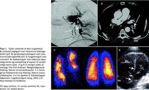 Når løsrevne trombefragmenter okkluderer en del af lungekarsengen, foreligger tilstanden ALE. Afhængig af komorbi-ditet, graden af okklusion og frisætning af vasoaktive stoffer udvikles der akut cor pulmonale, venstresidigt hjertesvigt og faldende cardiac output . I de sværeste tilfælde ses kardiogent shock, og terminalt indtræder der klinisk hjertestop [3, 4]. Ifølge Sundhedsstyrelsen blev der i Danmark i 2001 udskrevet 1.612 patienter med diagnosen »blodprop i lungen«, og i 1999 blev der registreret 269 dødsfald med denne diagnose som primær dødsårsag. Baseret på obduktionsstudier må de reelle tal formodes at være væsentligt højere [5, 6].