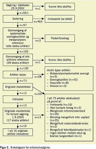 I alt resulterede søgningerne i 562 publik ationer (Figur 2 ). Ikkeengelsksprogede arbejder og artikler med for vores formål irrelevante emner blev sorteret fra. Det drejede sig primært om artikler om sundhedsøkonomi, fibrinnedbrydningsprodukter og anden billeddiagnostik. I alt 464 artikler blev således frasorteret (Figur 2). Referencelisterne i de ikkefrasorterede studier blev gennemgået for relevant litteratur. Artikler fundet ved databasesøgning og gennemgang af referencelister blev læst (n = 130), og originale meddelelser (n = 72) blev in- eller ekskluderet på baggrund af kriterierne i Figur 2. Som referencestandard valgte vi PA og/eller sektion. Desuden accepterede vi normale udfald af LS som referencestandard, idet undersøgelsen overbevisende udelukker diagnosen [13]. Ligeledes godtog vi high probability -udfald af LS som udtryk for tilstedeværelse af ALE [13]. I enkelte tilfælde blev klinisk opfølgning efter måneders forløb godtaget, hvis referencestandarden i studiet i øvrigt var PA og/eller sektion.