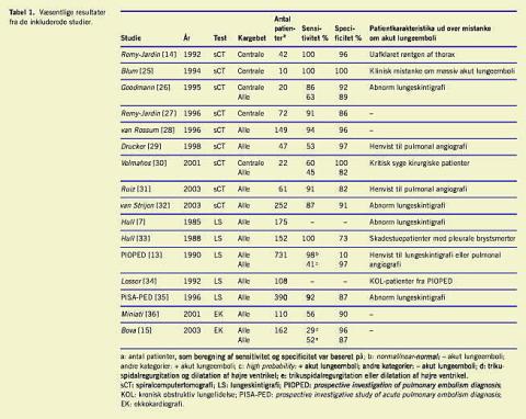 Resultaterne for sCT er opgjort forskelligt. To arbejder af Remy-Jardin et al [14, 27] vedrørte ALE i det centrale kargebet, mens van Rossum et al [28], Drucker et al [29], Ruiz et al [31] og van Strijen et al [32] angav resultater for hele lungekarsengen. I studierne blev der for central ALE fundet sensitiviteter på 91-100%, specificiteter på 86-96% og for alle kargebeter sensitiviteter på 53-94% og specificiteter på 82-97% (Tabel 1). Dette tyder på, at specificiteten er stort set den samme i det subsegmentære som i det centrale kargebet, mens sensitiviteten er væsentlig lavere subsegmentært. Risikoen ved sCT er således at overse isoleret subsegmentær ALE. Patienter med lette symptomer må formodes oftere at have isoleret subsegmentær ALE end patienter med massive symptomer. Dette understøttes af, at prævalensen af isoleret subsegmentær ALE opgives meget forskelligt afhængigt af den undersøgte patientgruppes karakteristika [28, 37]. Den kliniske betydning af isoleret subsegmentær ALE er uafklaret [26, 38], men er formentlig ikke neglige-abel hos patienter, der i forvejen er hjerte- eller lungesyge [27].
