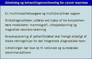Udredning og behandlingsmonitorering af cancer mammae er i dag en multimodalitetsopgave og en multidisciplinær opgave. Billeddiagnostikken udføres ved hjælp af tre komplementære billedmodaliteter og bør med få undtagelser, bl.a. undersøgelse af unge kvinder, anvendes i den rækkefølge de er nævnt ovenfor.