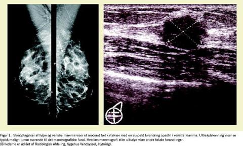 Ultralydundersøgelse af mammae har igennem mange år først og fremmest været brugt til at differentiere mellem cyster og solide forandringer hos kvinder med et palpationsfund. Ultralyd og mammografi er komplementære metoder. Mammografiundersøgelsen er afhængig af forskellen i vævenes røntgentæthed og den højeste sensitiviteten ses i det fedtholdige bryst, hvor den røntgentætte cancer kontrasterer godt til det mørke fedtvæv. Ultralydundersøgelsen derimod er afhængig af forskelle i vævenes ekkogenicitet, og den højeste sensitivitet ses i det homogene, kirtelrige bryst. Efterhånden som teknikken er blevet forbedret med anvendelse af højfrekvente transducere, og erfaringen er blevet større, benyttes ultralyd ikke længere alene til at differentiere mellem cystiske og solide strukturer, men også til bedre at kunne differentiere mellem benigne og maligne forandringer hos kvinder med mammografisk uspecifikke eller suspekte forandringer og/eller et palpationsfund [5, 6]. Ultralydskanning er i dag et selvstændigt element jævnbyrdig med mammografi i tripeltesten (palpation, mammografi og/eller ultralyd og nålebiopsi) og et uundværligt redskab i forbindelse med invasive procedure som guidede biopsier, tumormarkeringer [6] og ved vurdering af de regionale lymfeknuder. Patienter med bioptisk verificeret malignitet i en lymfeknude vil ikke få tilbudt sentinel node -operation.