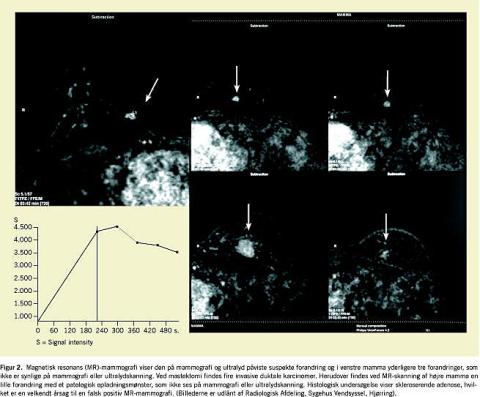 I en række undersøgelser har man påvist, at MR generelt har en meget høj sensitivitet, i nogle opgørelser op til 100%, mens man i de samme undersøgelser har fundet vekslende specificitet. Falsk positive resultater forekommer, og undersøgelsen skal indpasses i kvindens cyklus. Undersøgelsen bør derfor fortsat betragtes som et supplement til mammografi og ultralyd (Figur 1 og Figur 2 ).