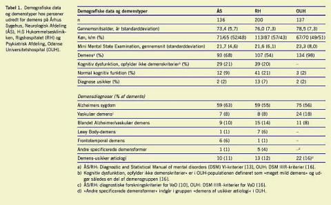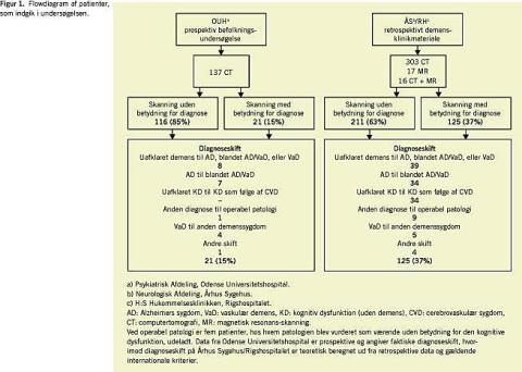 Materiale og metoder: Retrospektive data fra 336 patienter, som blev undersøgt med computertomografi eller magnetisk resonans-skanning i forbindelse med demensudredning på Demensklinikken, Neurologisk Afdeling, Århus Kommunehospital og på H:S Hukommelsesklinikken, Neurologisk Klinik, Rigshospitalet, blev sammenlignet med data fra 137 prospektivt undersøgte patienter fra en populationsundersøgelse på Psykiatrisk Afdeling, Odense Universitetshospital (Odense-Undersøgelsen).