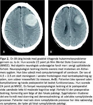 Billeddiagnostik med CT eller MR anses i dag i flere internationale retningslinjer og konsensusrapporter for at være en del af den grundlæggende diagnostiske udredning hos en patient med kognitiv dysfunktion [1]. Der er dog usikkerhed om, i hvor høj grad disse retningslinjer er tilstrækkelig evidensbaserede [2]. Operabel patologi påvist ved CT er relativt sjælden, og operation medfører kun i mindre omfang en bedring i patienternes kognitive tilstand [2, 3]. I et studie er det anført, at medicinsk behandling sjældent ændres som konsekvens af skanning [4], mens resultaterne af et andet tyder på, at skanning medfører ændring af både diagnose og behandling hos en betragtelig del af de patienter, der er henvist til demensudredning [5]. Er det nødvendigt at skanne alle? Det hævdes, at indikationsområdet kan afgrænses [6], således at man ved selektionskriterier kan reducere antallet af skanninger, samtidig med at man ikke svækker den diagnostiske sikkerhed eller reducerer kvaliteten af behandlingen [4, 7]. Undersøgelser og en nylig publiceret systematisk oversigtsartikel tyder dog på, at sådanne selektionskriterier for CT ikke fungerer tilfredsstillende [8].
