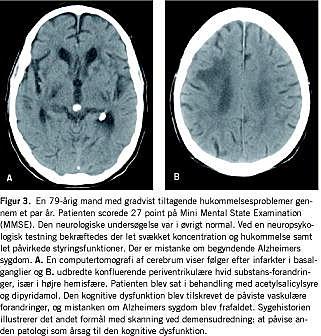 Ændring i diagnose og behandling som følge af skanning er i denne undersøgelse væsentlig højere end de 10-20%, der er fundet i tidligere studier [5, 6, 18]. Selv om to af disse studier var retrospektive, blev diagnose og behandling besluttet ved konsensus af klinikere i modsætning til i dette studie, hvor ændringer i diagnose og dermed behandling fulgte strikte fastlagte kriterier, herunder diagnostiske forskningskriterier for VaD [10], appliceret retrospektivt på journalmateriale. Dermed afspejler dette studie muligvis ikke til fulde den daglige kliniske diagnosticeringsproces. For eksempel var der i alt 99 patienter, som ikke opfyldte kriterierne for VaD, men som havde betydende CVD på skanningen. Af disse patienter havde 32 alligevel symptomer, der var forenelige med CVD (heraf 14 med akut debut eller fokale lateraliserede udfald), og en klinisk konsensus ville muligvis inkludere disse i VaD-gruppen. Dette ville medføre et fald i diagnoseændringer fra 37% til 28% og et tilsvarende fald fra 33% til 23% i behandlingsændringer. Det skal dog understreges, at de øvrige 67 patienter med CVD på skanningen ikke havde symptomer (ud over kognitiv dysfunktion), der kunne tyde på CVD, og skanning var derfor af afgørende betydning for afdækning af denne patologi (Figur 3 ).