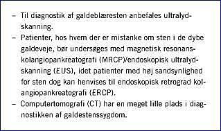 Hvad så med patienter, hvis symptomatologi taler for galdeblæresten, men hvor UL (eventuelt gentagne gange) er negativ? Her kan såvel endoskopisk ultralydskanning (EUS) som magnetisk resonans-kolangiopankreatikografi (MRCP) anvendes i nogle tilfælde, idet forfatternes personlige erfaring er, at begge undersøgelsesmodaliteter af og til afslører galdeblæresten, som ikke er set ved UL. I litteraturen findes der enkelte studier, hvori værdien af MRCP og EUS hos patienter mistænkt for galdeblæresten er undersøgt. MRCP blev sammenlignet med UL i et studie med 80 patienter, hos hvem der var mistanke om galdeblæresten [2]. Her fandt man, at der ved MRCP kunne påvises sten hos 43 ud af 44 patienter, hvor UL havde vist sten, men problemet i designet af dette studie var, at UL blev anset for at være referenceundersøgelsen, hvorfor den reelle sensitivitet af MRCP forblev ukendt. I et dansk studie undersøgte man værdien af at udføre EUS hos patienter med »galdestenssmerter«, hvor UL havde vist negative resultater [3]. Ved EUS kunne man påvste sten i galdeblæren hos 18 ud af de 35 patienter, der indgik i undersøgelsen, og fundet blev bekræftet hos 15 ud af 17 patienter, der efterfølgende blev kolecystektomeret. Der har herudover været enkelte studier, hvor EUS har været anvendt hos patienter med ideopatisk akut pankreatitis, dvs. hvor alkohol og metaboliske sygdom har været udelukket som genese, og UL har vist normale forhold. Disse studiers resultater tyder på, at man vha. EUS kan påvise større eller mindre konkrementer i galdeblæren hos omkring en fjerdedel af patienterne. Det er dog fuldstændig ukendt, hvor høj hyppigheden af galdeblæresten er hos patienter, der har normal galdeblære ved UL, men recidiverende øvre abdominal smeter. Det er imidlertid ikke i øjeblikket muligt at udføre MRCP/EUS hos alle disse patienter, og det er ganske givet heller ikke omkostningseffektivt. Man skal således ikke henvise alle patienter med »UL-negative galdestenssmerter» til MRCP/EUS, men det synes at være rimeligt at henvise udvalgte patientgrupper f.eks. patienter med akut pankreatitis af ukendt årsag.