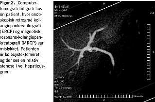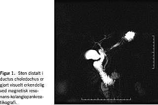 MRCP er en noninvasiv undersøgelse, der ikke udsætter patienten for ioniserende stråling (Figur 1 ). Undersøgelsen er reproducerbar og foruden information om gangsystemet i galdeveje og pancreas giver den også information om parenkymforandringer, f.eks. ved tumor, kolecystitis eller pankreatit. Ulempen ved MRCP er, at visse patientgrupper ikke kan MR-skannes (patienter med pacemaker eller med klaustrofobi, der ikke kan behandles med angstdæmpende midler samt svært adipøse patienter). Herudover kræver MRCP, at patienten forholder sig i ro under undersøgelsen, da billedkvaliteten ellers forringes (dette problem vil dog blive mindre i fremtiden pga. hurtigere MR-skannere).