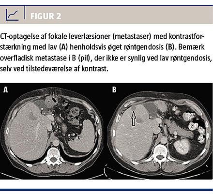 diagnosticering af KRLM. CT bruges både ved diagnosticering og monitorering af LM og giver mulighed for samtidig vurdering af intra- og ekstrahepatisk disseminering. Teknologiske fremskridt har resulteret i CT-billeder i bedre opløsning og i tyndere snit på kort tid (Figur 2). Den øgede hastighed i billeddannelsen har endvidere elimineret en del af vanskelighederne såsom vejrtrækningsartefakter. Disse fremskridt har øget sensitiviteten af CT betydeligt, fra 52% i ældre skannere til 85% i nyere skannere [17-19].