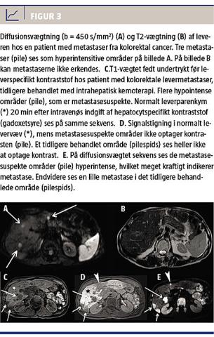 normalvæv eller i cystiske forandringer. Derfor har DW-MR vist sig at være meget effektiv i påvisning af LM (Figur 3). Sammenligning af DW-MR med konventionel MR har vist en sensitivitet for DW-MR på 83-90% mod 66-70% ved konventionelt MR [25]. Den øgede sensitivitet nedbringer ydermere antallet af falsk positive svar og muliggør bedre planlægning af fremtidige indgreb, eksempelvis leverresektioner.