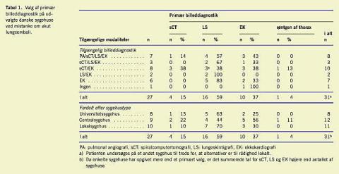 Resultater: Fra i alt 27 afdelinger blev spørgeskemaet besvaret, alle modtog patienter, hos hvem der var mistanke om akut lungeemboli. Til primær diagnostik anvendtes lungeskintigrafi på godt halvdelen af afdelingerne, ekkokardiografi på en tredjedel, mens man på resten benyttede spiralcomputertomografi. Fordelingen var stort set uafhængig af sygehustypen og af, hvilke modaliteter der fandtes lokalt.