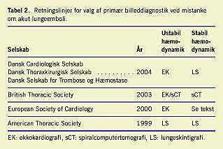 I de seneste retningslinjer fra nationale og internationale selskaber præsenteres forskellige tilgange til den primære diagnostiske håndtering af patienter mistænkt for ALE. Dette kan være en del af forklaringen på spørgeskemaundersøgelsens resultat. Fælles for retningslinjerne er, at de alle beskriver både fordele og ulemper ved alle metoder. De fleste anser desuden pulmonal a ngiografi for at være den definitive undersøgelse ved tvivl om diagnosen ved lungeskintigrafi eller spiralcomputertomografi. De overordnede anbefalinger fra disse selskaber er angivet i Tabel 2 , og nedenstående beskrives andre, mere detaljerede forskelle mellem de enkelte anbefalinger.