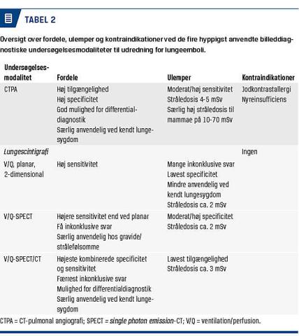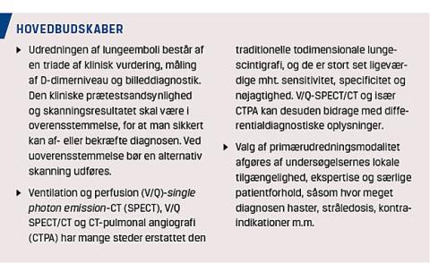 Der er ikke større forskel i den diagnostiske sikkerhed mellem state of the art-udført V/Q-SPECT, V/Q-SPECT/CT eller CTPA, hvorfor valget af primær billeddiagnostisk strategi kan afgøres af undersøgelsernes lokale tilgængelighed, ekspertise samt særlige forhold, f.eks. behov for hurtig diagnosticering hos ustabile patienter, stråledosis, kontraindikationer etc.