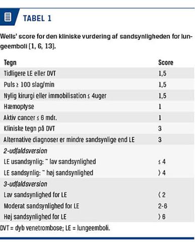 Kliniske scoreværktøjer som f.eks. Wells’ score, Geneva-score og for nylig YEARS, der bygger på få anamnestiske og kliniske fund, kan med fordel bruges til prædiktering af den kliniske sandsynlighed for LE [17] (Tabel 1). Testudfaldet er enten høj, moderat eller lav klinisk sandsynlighed [13]. YEARS har i et nyt studie vist lovende resultater med en reduktion af behovet for billeddiagnostik på 14% i forhold til en kombination af Wells’ score + D-dimertest.