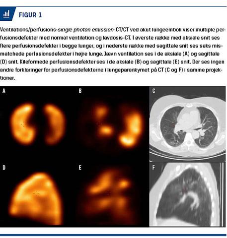 For nylig er tredimensional lungescintigrafi (single photon emission-CT (SPECT)) påvist at være todimensional lungescintigrafi overlegen til diagnostik af LE. Udføres V/Q-SPECT sammen med lavdosis-CT uden røntgenkontrast (V/Q-SPECT/CT) i en hybridskanner, kombineres den fysiologiske information fra V/Q-SPECT med den strukturelle information fra CT, hvilket yderligere forbedrer diagnostikken [2, 8, 9]. Vi vil kort gennemgå den diagnostiske udredning fra den initiale kliniske vurdering og D-dimertestning og derpå fokusere på de nye billeddiagnostiske muligheder.