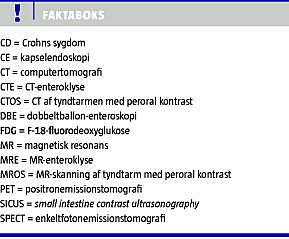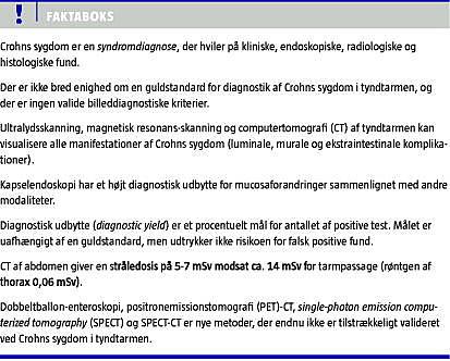 Summary Methods for diagnosing Crohn's disease of the small intestine Ugeskr Læger 2009;171(34):2383-2388 Diagnosing Crohn's disease in the small intestine can be troublesome. Traditionally, the small bowel is evaluated by ileocolonoscopy and small bowel follow-through or enteroclysis. In recent years MRI, CT, ultrasound and capsule endoscopy have emerged. All are validated and implemented in clinical practice. Double-balloon enteroscopy, PET-CT and SPECT are newer methods, which are still being evaluated in clinical trials. The purpose of this article is to review clinical studies focusing on the validity of modalities for diagnosing Crohn's disease of the small intestine.
