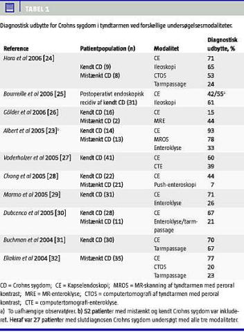 Flere prospektive studier har evalueret metoden hos patienter med mistænkt og kendt Crohns sygdom (Tabel 1 ) [23-32]. Triester et al udførte i 2006 en metaanalyse af det diagnostiske udbytte for CE sammenlignet med andre modaliteter [33]. Diagnostisk udbytte (diagnostic yield) er et procentuelt mål for antallet af positive test; dvs. antal positive test divideret med det totale antal test. Målet er uafhængigt af en guldstandard, men udtrykker ikke risikoen for falsk positive fund. Denne risiko bekræftes i et studie af Goldstein et al, hvor man fandt erosioner hos 13,8% af raske voksne undersøgt med CE [34]. I metaanalysen fandt man ikke signifikant højere udbytte af CE hos patienter med mistænkt Crohns sygdom, men hos patienter med kendt Crohns sygdom var det diagnostiske udbytte signifikant højere for CE end for alle andre undersøgelser [33]. Sammenlignet med MR og CT fandt man i to studier et højere udbytte af CE for proksimale læsioner [26, 27].