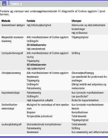 I dag findes der en lang række metoder til undersøgelse af tyndtarmen. Hver modalitet har sine fordele og ulemper, hvilket er opsummeret i Tabel 2 . I de foreliggende studier opnås et højt diagnostisk udbytte ved CE, MR, CT og ultralydsskanning. Valget af undersøgelse bør derfor træffes på baggrund af den kliniske problemstilling samt, hvilken modalitet der kan tilbydes på det lokale sygehus, og hvilken erfaring den enkelte radiolog eller gastroenterolog besidder. CE kan overvejes som andenlinje-undersøgelse hos patienter med mistænkt Crohns sygdom, der ikke er bekræftet ved et standardudredningsprogram bestående af ileokoloskopi og skanning af tyndtarmen. CE har et højt diagnostisk udbytte, men man bør være opmærksom på risikoen for falsk positive fund. Det er endnu ikke belyst, om anvendelsen af CE som førstevalgsundersøgelse medfører tidligere diagnostik og dermed en positiv effekt på det kliniske forløb sammenlignet med andre modaliteter. I den præoperative vurdering af Crohns sygdom eller ved kompliceret sygdom er MR og CT fordelagtige, idet der opnås en evaluering af samtlige manifestationer af sygdommen, herunder om der er stenose, absces eller fistel. Ultralydsskanning har samme egenskaber, men et højt udbytte forudsætter, at undersøgelsen udføres af en trænet radiolog med særlig interesse i området.