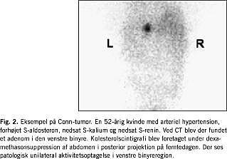 Under dexamethasonsuppression vil det normale binyrebarkvæv først kunne erkendes visuelt fra og med femte dag. Viser scintigrafien aktivitetsoptagelse i binyreregionerne før dette tidspunkt, vil det derfor være foreneligt med hyperfunktion. Ud fra aktivitetsoptagelsesmønsteret kan abnormiteten defineres: unilateral aktivitetsoptagelse vil være forenelig med adenom (Fig. 2), og bilateral aktivitetsoptagelse med hyperplasi.
