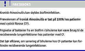 Patienter med cystisk fibrose (CF) har obligat forekomst af kronisk rhinosinuitis, og det er vist, at tilstedeværelse af biofilmdannende bakterier i næse-bihulesekret hos CF-patienter er forbundet med lungekolonisering med samme bakteriestamme [2]. Forekomst af kroniske biofilminfektioner i bihulerne hos CF-patienter antages at bidrage til lungekolonisering og efterfølgende vedligeholdelse af en kronisk lungeinfektion.