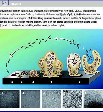 Dannelsen af biofilm opdeles i flere trin (Figur 1 ). Først tiltrækkes og hæfter planktoniske bakterier ved hjælp af pili eller deres kapsel reversibelt til en overflade, og siden irreversibelt. Herfra fortsætter væksten af bakterier til en mikrokoloni sideløbende med dannelsen af en polysakkaridmatriks, som bakterierne indlejrer sig i. Sidste trin i den modne biofilms livscyklus er frigivelse af planktoniske datterceller, som igen kan starte nye biofilmkolonier [5, 6].