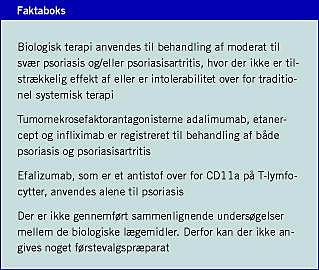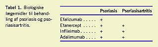 Ny viden om sygdomsmekanismer har muliggjort en ratio-nel udvikling af specifikt virkende biologiske lægemidler. Den samtidige erkendelse af sygdommens sværhedsgrad, herunder forekomst af komorbiditeter, har øget interessen for at anvende effektive behandlingsmidler. Som det fremgår af Tabel 1, er der et delvist sammenfald mellem psoriasis og psoriasisartritis mht. de anvendte biologiske lægemidler. Tumornekrosefaktor (TNF)-α-antagonisterne adalimumab, etanercept og infliximab er virksomme ved såvel hud- som ledforandringer, mens efalizumab, som er et antistof over for CD11a på T-lymfocytter, kun virker på hudsygdommen.