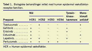 En bedre forståelse af de cellulære signalveje, der regulerer vækst, har i cancerbehandlingen betydet, at fokus er rettet mod biologisk behandling og udvikling af en række nye målrettede (targeterede) behandlinger (Tabel 1 ). P.t. er der identificeret mere end 100 forskellige genprodukter, som er potentielle mål for ny anticancerterapi. Endokrin behandling har siden 1896 været anvendt ved brystcancer og er, efter at tamoxifen og aromatasehæmmere blev udviklet i 1970'erne, den bedst etablerede og mest succesfulde målrettede terapi. Adskillige nye målrettede behandlinger testes nu ved metastaserende cancer mammae (MBC). I denne statusartikel omtales alene monoklonale antistoffer og tyrosinkinaseinhibitorer, der er målrettede human epidermal vækstfaktorreceptor (HER)-familien og vaskulær endotel vækstfaktor (VEGF).