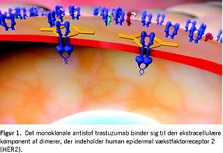 Trastuzumab er et rekombinant, humaniseret monoklonalt antistof, der er rettet mod det ekstracellulære domæne af HER2 (Figur 1 ) [1]. Resultaterne af prækliniske undersøgelser tyder på, at stoffet inducerer antistofmedieret cytotoksicitet, hæmmer signalvejene fra såvel HER2 som andre medlemmer af HER-familien og har antiangiogene egenskaber. HER2-amplifikation ses i 18-25% af alle primære brystcancere [2] og er i en række studier fundet at have en uafhængig negativ prognostisk værdi [3, 4]. Det er påvist, at HER2-overekspression eller genamplifikation er en nødvendig forudsætning for, at en patient kan forventes at respondere på trastuzumab [1].