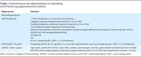 Den første TNF-hæmmer, som blev godkendt til behandling af JIA, er etanercept (ETN). Et todelt randomiseret kontrolleret forsøg (RCT) i 2000 viste signifikant effekt af ETN (mindre sygdomsaktivitet og bedre sygdomskontrol hos børn med svær polyartikulær JIA), refraktære eller intolerante over for methotrexat (MTX) [8] (Tabel 1). Et nyligt publiceret RCT-studie viste effekten af tidlig behandling med ETN + MTX vs. MTX + placebo med efterfølgende tillæg af ETN ved manglende effekt ved poly-JIA [9]. Effekten er udtrykt som et ACRped30-respons, med mindst 30% forbedring i tre af seks målparametre og evt. forværring i højst ét af målparametrene (Tabel 2). Studiet viste, at flere børn opnåede ACRped30-respons med ETN + MTX [10] i uge 12 (94,3%) end med MTX + placebo (60,6%), p = 0,001. I uge 48 sås ingen forskel med hensyn til opnåelse af remission, men inaktiv sygdom blev opnået hurtigere i gruppen behandlet med ETN + MTX fra start [9].