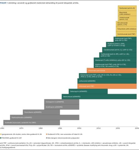 En mere aggressiv behandlingstilgang i de seneste to årtier samtidig med påbegyndelsen af den biologiske æra (Figur 1) har gjort det muligt at opnå remission som behandlingsmål for JIA [4, 7]. Ifølge American College of Rheumatology (ACR) anbefales biologisk behandling til børn, der har JIA, som ikke responderer på standardbehandling med sDMARDs [6]. Omtrent 60% af alle med JIA behandles med sDMARDs og en tredjedel med biologisk medicin [3]. I nye anbefalinger bør tidlig biologisk behandling overvejes ved forekomst af højrisikofaktorer [5] (positiv anticyklisk citrullineret peptid eller ledskade), involvering af højrisikoled (nakkehvirvler, håndled, sacroiliacaled eller hofteled) og generel høj sygdomsaktivitet. I denne artikel har vi forsøgt at give en status for behandlingsstrategien og langtidssikkerheden af de biologiske præparater til behandling af JIA, nu 20 år efter indførelsen.