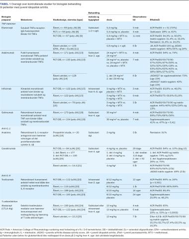 Tocilizumab (TCZ) er vist effektiv i et RCT med 112 børn med sJIA [22], hvor 12 ugers dobbeltblindet randomisering med TCZ vs. placebo blev efterfulgt af et åbent studie varende op mod fem år. Fravær af feber samt ACRPed30-respons var defineret som primære endemål og var efter første fase signifikant højere i TCZ-gruppen end i placebogruppen (85% vs. 24%, p < 0,001). Fravær af feber og ACRPed70/90-respons blev opnået for hhv. 59% og 48%. Flere i TCZ-gruppen end i placebogruppen oplevede alvorlige bivirkninger såsom infektion, neutropeni og forhøjet niveau af aminotransferase [22]. For børn med poly-JIA er der også påvist effekt af behandlingen i et RCT [23]. Efter 40 ugers behandling sås nedsat tendens til sygdomsopblussen i TCZ-gruppen vs. placebo- (25,6% vs. 48,1%) [23].
