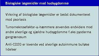 Psoriasis og psoriasisgigt er de eneste sygdomme inden for dermatologien, hvor effekten af biologisk medicin er blevet systematisk undersøgt i store prospektive, randomiserede og placebokontrollerede forsøg. Biologisk behandling er domineret af de tre godkendte tumornekrosefaktor α-blokkere (infliximab, etanercept og adalimumab) og efalizumab (et antistof mod lymfocytadhæsionsmolekyle CD11a, som hæmmer cellemigration og aktivering). Imidlertid har biologisk behandling også fundet en plads i terapien af andre inflamatoriske hudsygdomme, og formålet med denne oversigt er kort at resumere den nuværende status inden for dette felt.