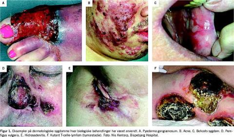 Tumornekrosefaktor (TNF)α-blokade er en effektiv strategi mod autoimmune sygdomme, som er medierede via Th1- og Th17-lymfocytter. Som eksempler (se Figur 1) kan nævnes pyoderma gangrænosum, en kronisk, behandlingsresistent, ulcererende hudsygdom med en immunpatogenese, som ligner Crohns sygdom. Før indførelsen af de biologiske behandlinger var behandlingen af pyoderma gangrænosum svær og krævede langvarig brug af systemisk glukokortikoid i kombination med immunosuppressiva som ciclosporin. Pyoderma gangrænosum responderer prompte på TNFα-antistoffer, hvilket er bekræftet i talrige kasuistikker [1]. Acne conglobata og hidroadenitis suppurativa, som er patogenetisk relaterede til pyoderma gangrænosum responderer også på anti-TNFα-behandling.