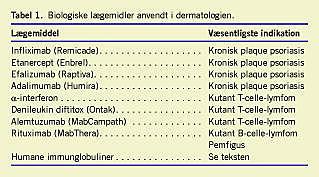 Biologiske lægemidler er proteiner, der har farmakologisk aktivitet og er udviklet fra levende celler. Disse proteiner er typisk store molekyler, som kan degraderes i mave-tarm-kanalen, hvorfor de gives ved subkutan, intramuskulær eller intravenøs injektion. Det væsentligste terapeutiske fremskridt inden for dermatologi er introduktionen af biologiske stoffer i form af antistoffer eller receptorfusionsproteiner rettet mod cytokiner og lymfocytantigener. De biologiske stoffer anvendes i visse tilfælde til behandling af kutane lymfomer og autoimmune bulløse hudsygdomme, men især til psoriasis (Tabel 1 ), som i dag opfattes som en immunologisk betinget inflammatorisk hudsygdom. Denne erkendelse har medført, at en række biologiske stoffer er under udvikling til behandling af psoriasis og andre inflammatoriske hudsygdomme.