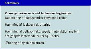 De her omtalte biologiske lægemidler har flere forskellige virkningsmekanismer. De vigtigste er depletering af patogenetisk betydningsfulde celler, hæmning af leukocytrekruttering, hæmning af cellekontakt og ændring af cytokinbalancen.