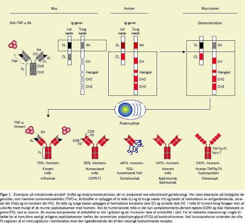 Tre produkter, som hæmmer TNF-α, er på markedet i Danmark, og flere er på vej (Figur 1). Etanercept er et fusionsprotein, hvori den ekstracellulære del af den ene af de to TNF-receptorer (TNF-R2) indgår. Fusionsproteinet binder til frit TNF-α og TNF-β og hæmmer deres binding til TNF-receptoren. Infliximab og adalimumab er henholdsvis et kimært og et humant mAb, der begge specifikt hæmmer binding af TNF-α til TNF-receptorerne. Begge stoffer binder desuden membranbundet TNF-α og medfører komplementaktiveret lyse af de TNF-bærende celler in vitro og muligvis in vivo. Binding til membranbundet TNF-α og dermed lyse af cellerne kan forklare, at infliximab og adalimumab begge har effekt ved Crohns sygdom, men at etanercept ikke har [17].