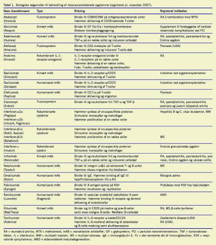 For at nedsætte clearance og i forsøget på at mindske im-munogeniciteten er polyethylenglycol koblet til visse rekombinante cytokiner og antistoffer [4]. Tabel 1 viser biologiske lægemidler registreret pr. november 2007 til behandling af ikkecancerrelaterede sygdomme.