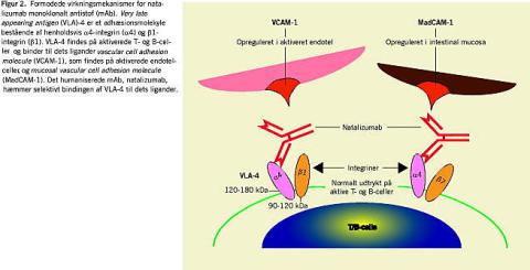 Hæmning af leukocytrekruttering kan opnås med antistoffer, som hæmmer bindingen af leukocytter til blodkarrenes endotelceller, hvorved betændelsescellernes migration til vævet modvirkes. Et eksempel på et biologisk lægemidler, som hæmmer leukocytrekuttering, er natalizumab, som først har fundet anvendelse ved multipel sklerose [8, 9]. Natalizumab er et humaniseret mAb af IgG4-subklasse rettet mod α4-integrin, som sammen med β1-integrin udgør det såkaldte very late appearing antigen (VLA)-4/CD49d-adhæsionsmolekyle (Figur 2). VLA-4 findes især på overfladen af aktiverede T- og B-celler, og binding til dets ligand, vascu lar cell adhesion molecule (VCAM)-1/CD106, som findes på aktiverede endotelceller, udgør et vigtigt tidligt stadie i T- og B-cellers migration fra blodbanen ved mange immuninflammatoriske processer. Som vist i Figur 2 blokerer natalizumab interaktionen mellem α4-integrin og VCAM-1, hvorved den perivaskulære inflammatoriske proces hæmmes [10, 11].