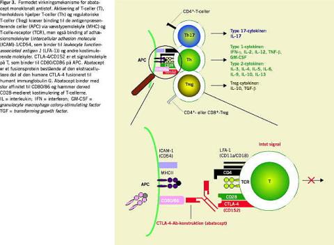 Hæmning af cellekontakt foregår typisk ved, at kontakten mellem T-celler og APC hæmmes. Derved modvirkes aktiveringen af T-cellerne. Hæmningen kan både være på grund af direkte interaktion mellem major histocompatibility complex (MHC)-molekylet og T-celle-receptoren (TCR), men også via en binding til kostimulerende molekyler eller adhæsionsmolekyler på cellerne. Et eksempel på et biologisk lægemiddel, som blokkerer kostimulering, er fusionsproteinet abatacept (Figur 3). Abatacept består af et immunglobulin fusioneret til den ekstracellulære del af cytotoksisk T-lymfocyt-antigen (CTLA)-4/CD152-molekylet. CTLA-4 binder med stor affinitet til CD80/CD86 på APC, og abatacept hæmmer derved kostimulering af CD28-bærende T-celler og dermed aktivering og cytokinproduktion af T-cellerne [12]. Abatacept er registeret til behandling af anti-tumornekrosefaktor (TNF)-refraktær RA i kombination med methotrexat (MTX) [13].