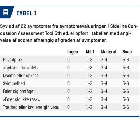 Diagnosen stilles hovedsageligt på baggrund af subjektive symptomer via Sideline Concussion Assessment Tool 5th edition (SCAT-5) (Tabel 1) [2]. Derfor er det af klinisk interesse at identificere en objektiv biomarkør med høj specificitet og sensitivitet. Dels i den akutte fase for at identificere hjernerystelsen, således at den pågældende spiller udtages for at undgå endnu et slag mod hovedet, dels for at monitorere restitution af hjernen, så spilleren kan genoptage sin træning efter fuld restitution. Intervention efter konstatering af SRC følger et kommotionsregime efter nationale guidelines. Diagnosen kronisk traumatisk encefalopati (CTE) kan kun stilles ved obduktion, og der er derfor behov for at finde mulighed for at diagnosticere CTE tidligt i den kroniske fase for at have et rationelt grundlag for behandling [3]. I denne artikel vil vi, med udgangspunkt i den nyeste litteratur, give et overblik over potentielle biomarkører til diagnosticering af SRC i den akutte og kroniske fase.