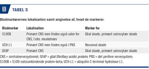 Biomarkører i blodet er endnu en noninvasiv metode til diagnosticering af SRC [6]. Mulige biomarkører er ubiquitin-C-terminal hydrolase-L1 (UCH-L1), glial fibrillary acidic protein (GFAP) og S100-calciumbindende protein-beta (S100B) (Tabel 3). Proteinerne kan måles i blodet, da blod-hjerne-barrieren nedbrydes efter et mildt hjernetraume [6]. UCH-L1 regnes for at have høj specificitet for og høj koncentration i neuroner, hvilket har gjort proteinet til en lovende markør for neuronal skade efter et mildt hjernetraume [6]. GFAP, som bl.a. findes i astrocytter, har ligeledes vist sig at være egnet som markør for hjernetraume som udtryk for glial skade. S100B har i tidligere studier vist sit potentiale som markør for mildt hjernetraume på trods af, at S100B kan findes uden for centralnervesystemet [6].
