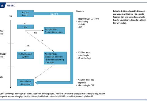 Anvendelse af biomarkører til diagnosticering af SRC hos f.eks. fodboldspillere kan have klinisk betydning for evaluering af prognosen, specielt hos patienter, hvor restitutionen trækker ud (Figur 1). Både blodmarkører og MR-teknikker kan anvendes, men det kræver større, prospektive kohortestudier at validere den nuværende viden på området. Ved den kroniske fase med symptomer på CTE er fokus på detektion af tauprotein og neuroinflammation, men det kræver yderligere forskning i CTE at kunne specificere en tidlig biomarkør.