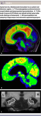 spinalvæsken (CSV) og øget kortikalt optag af positronemissionstomografi (PET)-ligander med bindingspotentiale til aβ (f.eks. 11C-Pittsburg-compound B og forskellige 18F-mærkede ligander), der begge afspejler øget kortikal aβ-aflejring, og 2) reduceret kortikal 18F-fluorodeoxyglukose (FDG)-PET-aktivitet, forhøjet totaltau (t-tau) og fosforyleret tau (p-tau) i CSV samt CT- eller MR-skanningsverificeret atrofi, der afspejler neurodegeneration (Figur 1). I 2010 [7] (med opdateringer i 2013 [8]) blev en samlet model for ændringer i disse biomarkører publiceret. Således formodes nedsat aβ i CSV at være den tidligste ændring efterfulgt af øget kortikalt optag af PET-ligander med affinitet til aβ derefter stigning i t-tau i CSV efterfulgt af atrofi målt med MR-skanning og synaptisk dysfunktion målt med 18F-FDG-PET. I dette stadie opstår de første milde kognitive symptomer [8]. Der vil være betydelig tidsmæssigt overlap mellem ændringerne, og ændringerne i biomarkørerne er ikke velafgrænsede faser, der skal løbe til ende, før næste fase begynder, og kan heller ikke sikkert tilskrives en årsagssammenhæng. Aflejring af aβ begynder formentligt 10-15 år før symptomdebut [9] og er en nødvendig, men ikke tilstrækkelig årsag til udviklingen af AS.